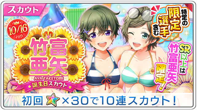 公式 八月のシンデレラナイン ハチナイ V Twitter Happy Birthday 竹富亜矢誕生日 スカウト開催 24時間限定 10連スカウトで獲得できる スカウトチケット 2で 対象のssr竹富を いずれか確定でお迎えできます 初回10連スカウトは ナインスター30個